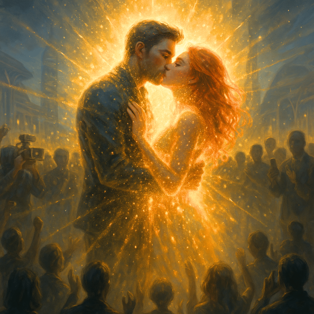 Finalmente, cuando sus labios se encontraron en un beso anhelado por siglos, la realidad se quebró. Un destello de luz los envolvió y, ante los ojos atónitos de millones, desaparecieron en una explosión de energía que iluminó el cielo como si un nuevo sol hubiera nacido. Por un instante eterno, el mundo entero quedó suspendido en un silencio absoluto, como si la misma existencia se hubiera detenido para presenciar aquel momento sagrado. La multitud, incapaz de comprender lo que acababa de ocurrir, sintió una oleada de emociones indescriptibles: asombro, reverencia y un amor tan puro que parecía trascender los límites de la comprensión humana.